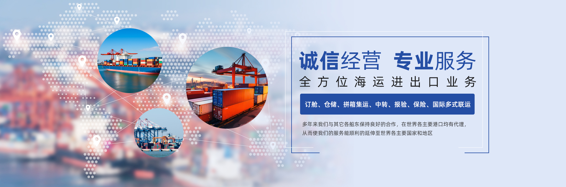业务范围:订舱、仓储、拼箱集运、中转、报验、保险、国际多式联运。